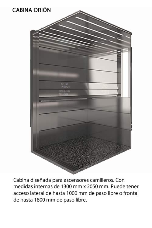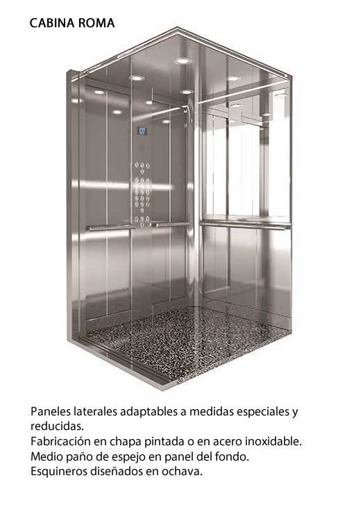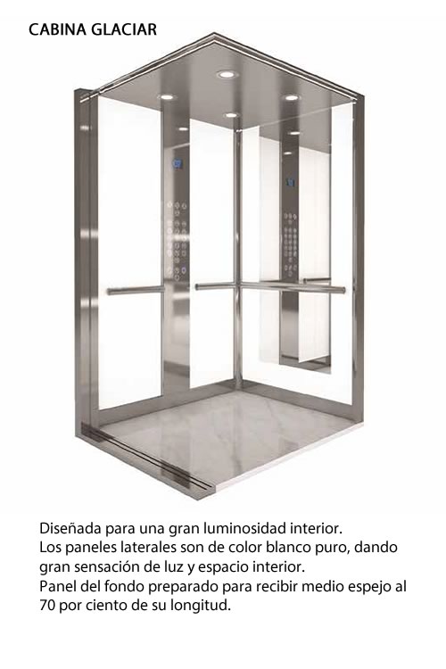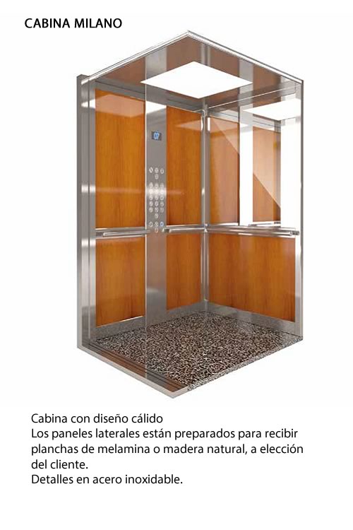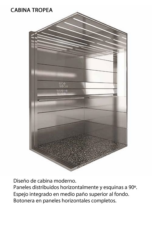 De acuerdo a la tipología de ascensor que el cliente requiera, la cabina es adaptable o estandarizada. A pedido se fabrican cabinas especiales, vidriadas, panorámicas, estancas, industriales, grandes cargas o altas velocidades.