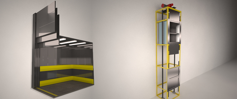 Pequeño montacargas accionado por tambor de arrollamiento en posición superior. Ideal para pequeñas cargas de mercadería hasta 100 o 150 kg, que deban salvar varios niveles. Puede entregarse con varios estantes internos y dotado de puertas tipo guillotina con seguridad eléctrica incorporada.